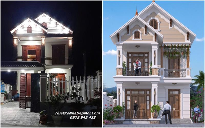 Anh Hạnh ở TP Đông Hà có mảnh đất phố rộng 7m mặt tiền dài hơn 20m. Cần xây nhà 4 phòng ngủ có sân thượng và phòng thờ. Sau khi KTS tư vấn thiết kế xây nhà phố tân cổ điển 1 trệt 2 lầu có sân thượng như phối cảnh xong. Anh mua vật tư và kêu nhân công xây dựng cho tiết kiệm. Đây là hình ảnh góc nhìn hoàn thiện theo phối cảnh