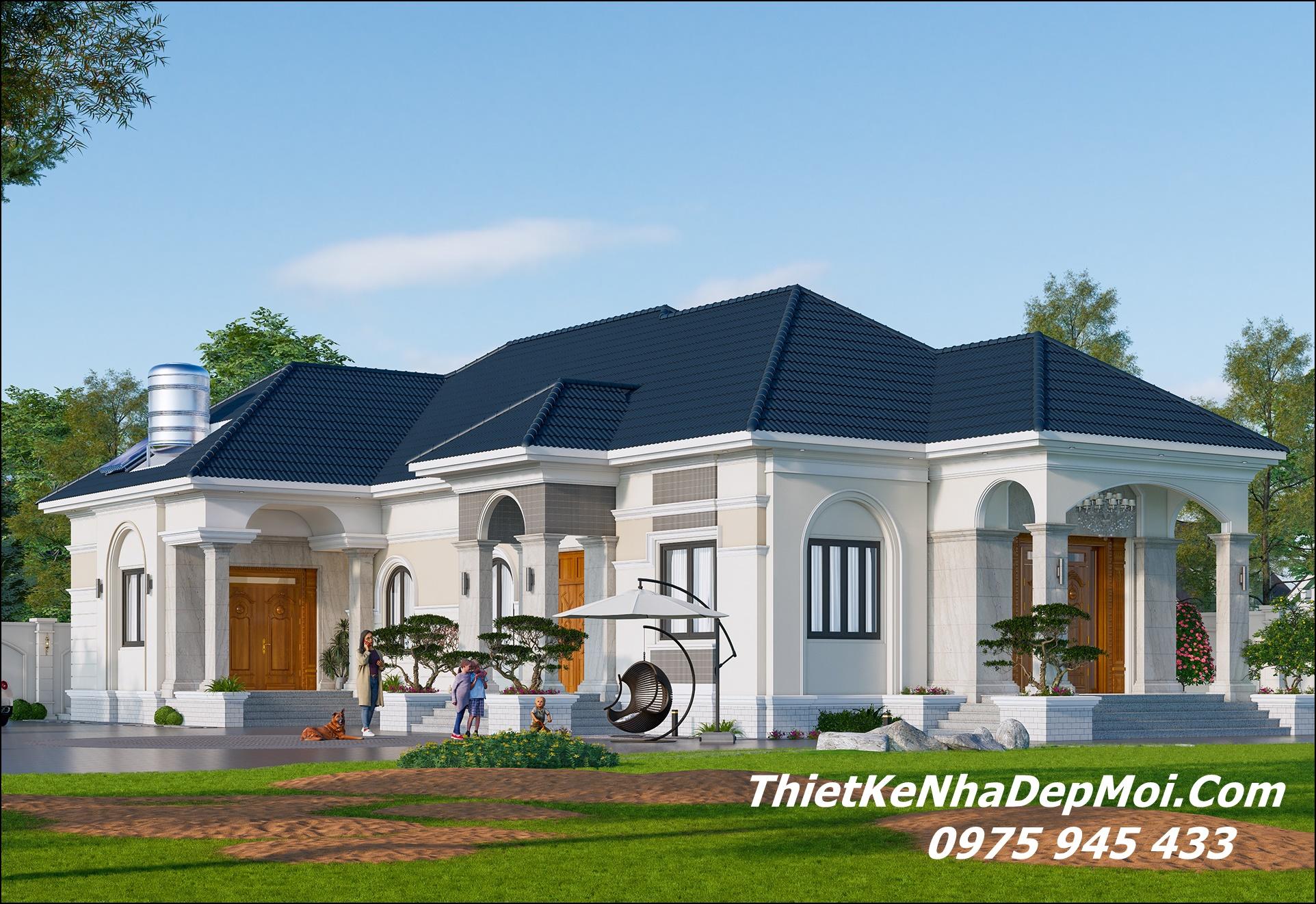 Mẫu nhà vườn 1 tầng 5 phòng ngủ 1 phòng thờ anh Thành có diện tích sử dụng 270m2. Kích thước thiết kế chưa tính mái văng đua ra xung quanh 60cm thì 14x24m. Còn nếu tính theo mét vuông giọt ranh phủ bì cho phần giao khoán nhân công ở quê thì 306m2 cả 2 mái sảnh chính và phụ trước sau