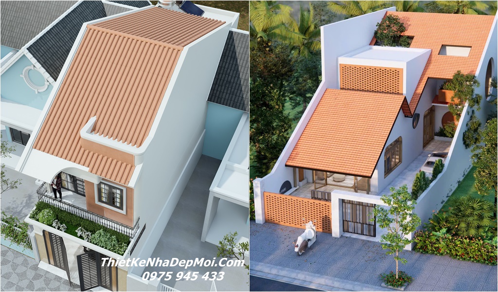Kiến trúc nhà mái dốc lợp ngói đỏ truyền thống là kiểu kiến trúc nhà lô phố mặt tiền. Lợp ngói đất nung tiết kiệm nhưng rất bền đẹp theo tháng năm. Thứ 2 phù hợp với điều kiện tự nhiên, khí hậu nắng nóng mưa nhiều nước ta. Dự án thiết kế nhà phố mái ngói 1 trệt 1 lầu 2025