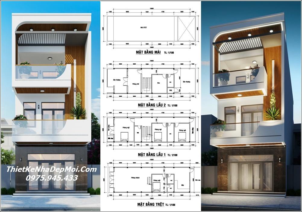 Bản vẽ nhà phố có gara ngang 5.5m dài 17m ra sau dưới đây. Cũng là kiến trúc nhà phố tối giản kiến trúc 3 tầng nhưng phía trên sàn áp mái lợp tole tiết kiệm. Mặt bằng và phối cảnh như sau